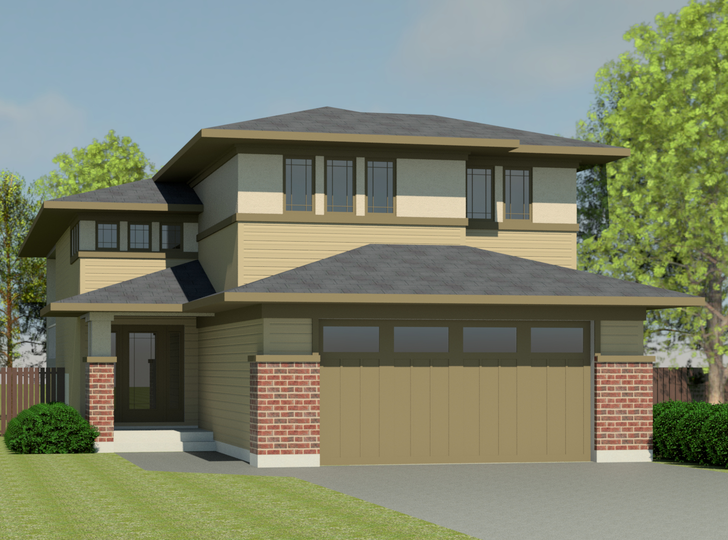 The Prairie Clearbrook-1540 is designed in the new, trendy, bungaloft style, featuring the master suite over the garage. The street appeal is enhanced by brick pillars on the garage, covered entry column and multiple stucco colors and buildouts to reinforce the horizontal lines of this prairie style plan. This prairie plan features: